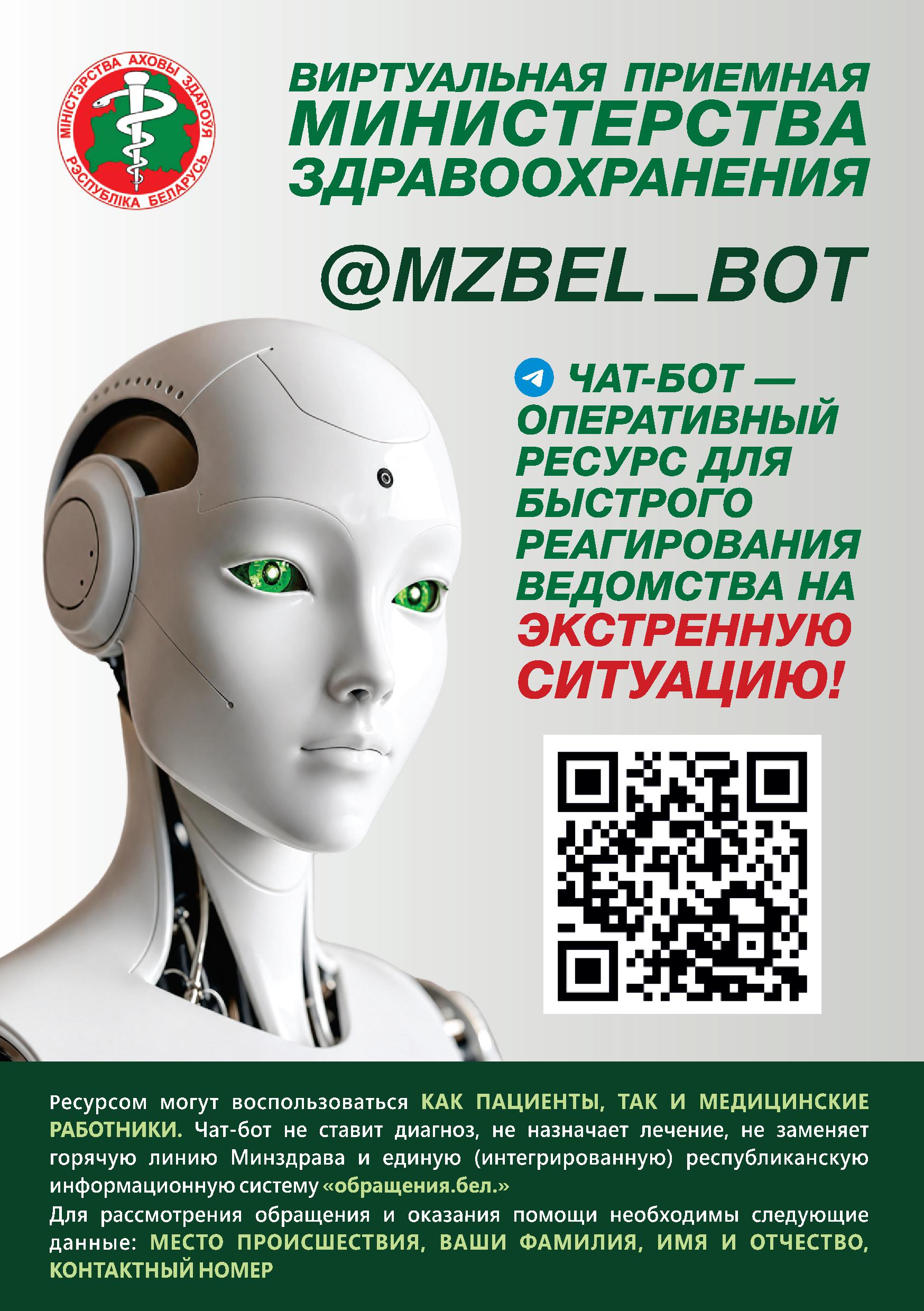 Этот чат-бот не ставит диагноз и не назначает лечение. Данный чат не заменяет горячую линию Минздрава и единую (интегрированную) республиканскую информационную систему учета и обработки обращений граждан и юридических лиц обращения.бел.